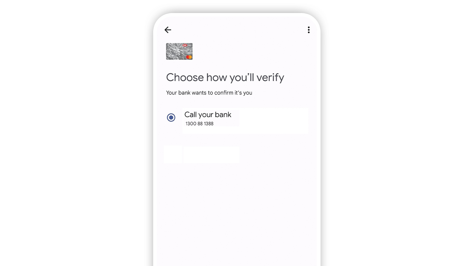 Step 2: Choose 'Call your bank' as your card verification method. The primary cardholder will need to call the bank using the contact number displayed on this screen to complete the mobile wallet provisioning process. An HSBC Contact Centre agent will perform verification process and activate card provisioning.